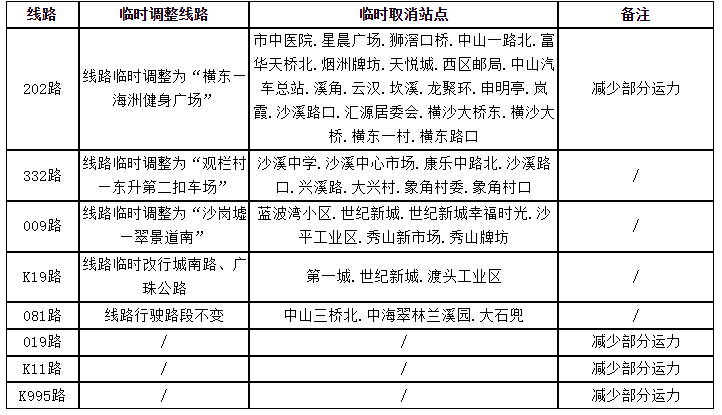 根据上级有关工作部署,因疫情防控需要,即时起,沙溪镇及大涌镇公交线路暂停营运,具体安排如下:公共汽车010、017、020、029、048、056、057、076、077、078、079、201、K06路等13条公交线路暂停营运;公共汽车009、019、081、202、332、K11、K19、K995路等8条公交线路临时调整线路首末站及减少运力(调整安排见下表)。