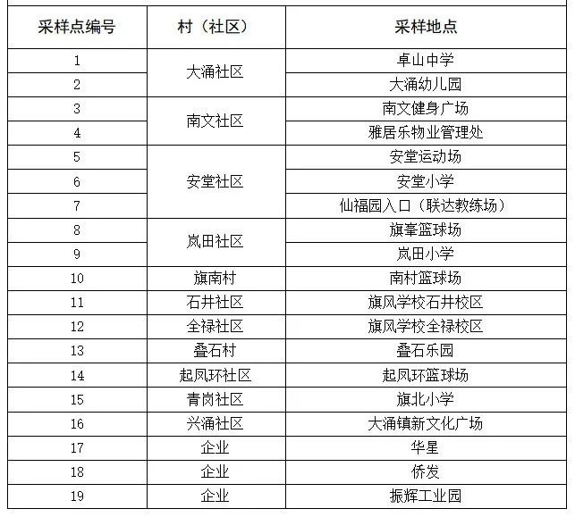 各村(社区)固定采样点和在部分企业设置的临时采样点见下表(点击图片可放大)。