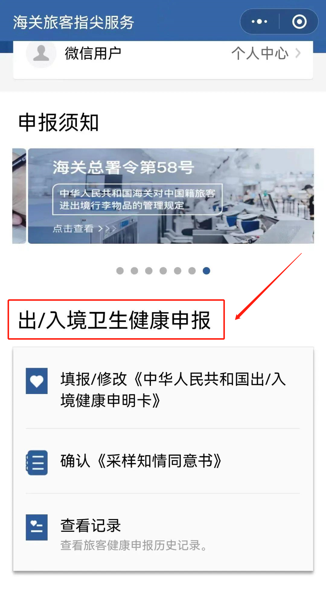 (1)微信搜索【海关旅客指尖服务】小程序即可找到→选择填报/修改《中华人民共和国出/入境健康申明卡》→填写完毕后截图保存海关码,方便入关查验。