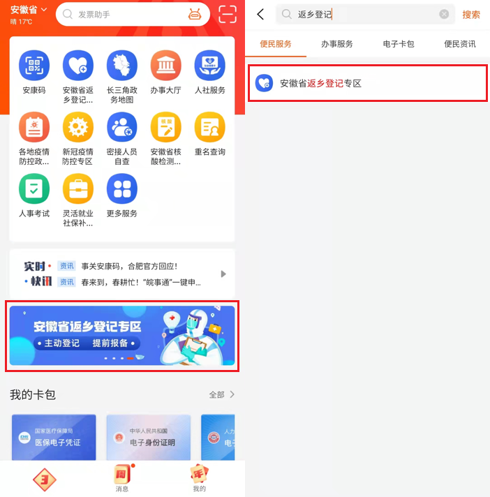 下载“皖事通”APP,注册登录后在“皖事通”省级首页点击下面轮播图或者在搜索框中搜索“安徽省返乡登记专区”,点击进入专区服务页面。