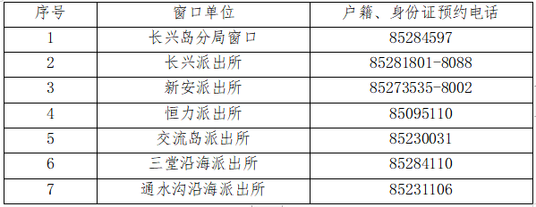 自即日起,长兴岛公安分局户籍、居民身份证及各派出所窗口办理业务实行电话预约。何时取消预约办理方式另行通知。