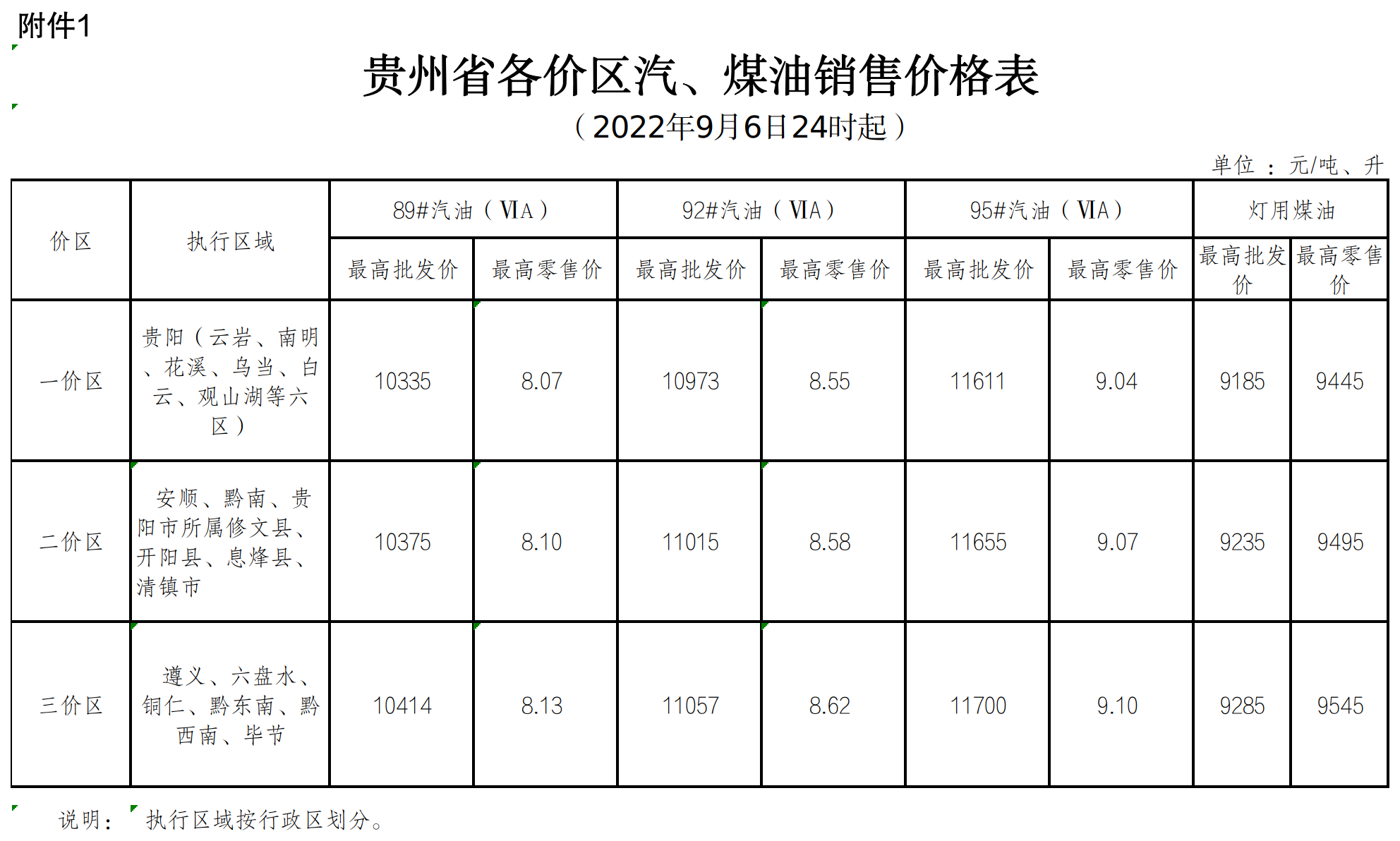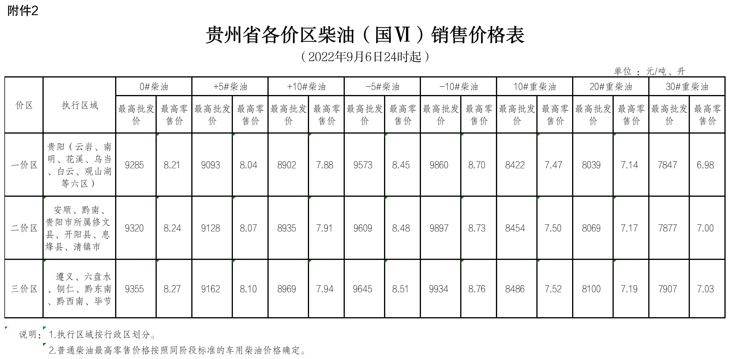 二、贵州省各价区汽、煤油销售价格表