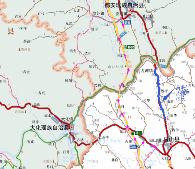 马山县城G355线←→兰海高速公路马山连接线←→进入兰海高速公路马山收费站(G75,往都安方向)←→兰海高速公路都安收费站(出口)←→都安县城(如下图所示)