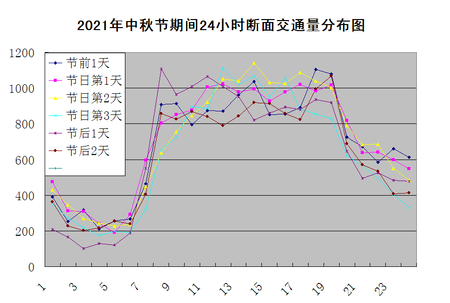 经对2021年中秋节假期前1天、节日3天和节日后2天24小时车流量分布情况进行分析,结合以往节假日交通量变化特点,预计2022年中秋节假期期间马山县辖区普通国省干线车流量高峰时段出现在8时-13时、 15时-18时。(如图2所示)
