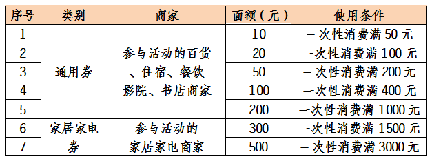 “通用券”:面额为10元、20元、50元、100元、200元,可在参与活动的“百货、住宿、餐饮、影院、书店”等商家消费抵扣使用;