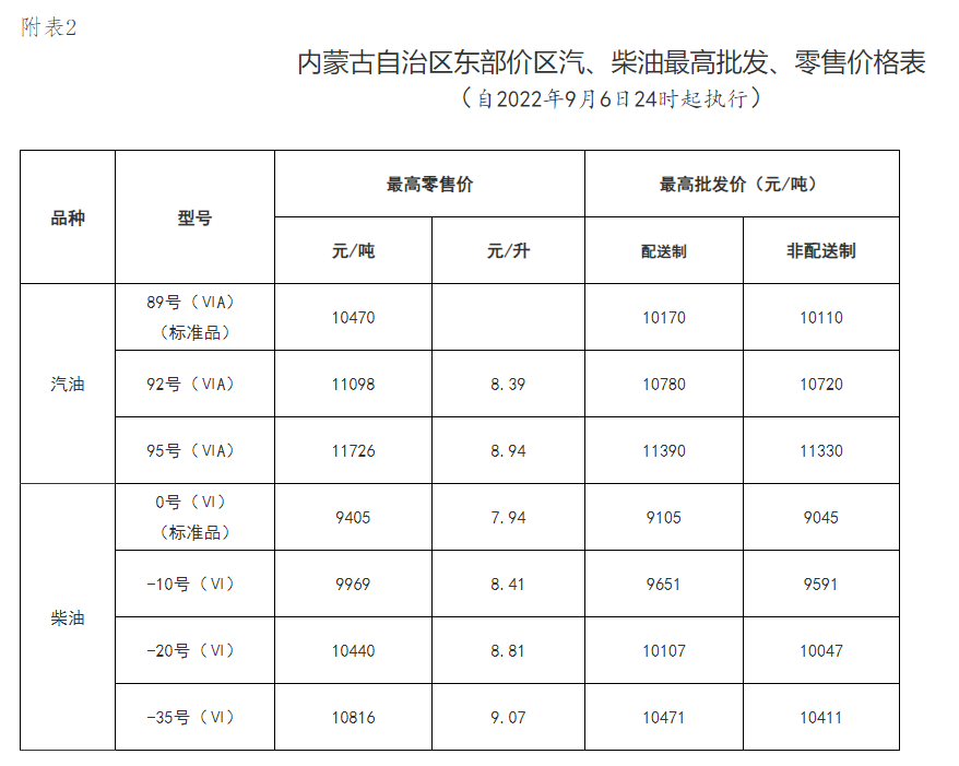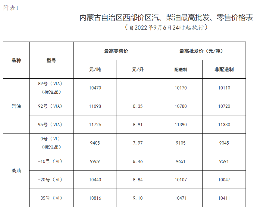 一、自2022年9月6日24时起,我区汽、柴油价格(标准品)每吨分别上调190元和185元,非标准品汽、柴油最高零售价格按照国家规定的品质比率也相应调整(具体价格详见附表)。成品油零售企业可在不超过汽、柴油最高零售价格的前提下,自主制定具体零售价格。