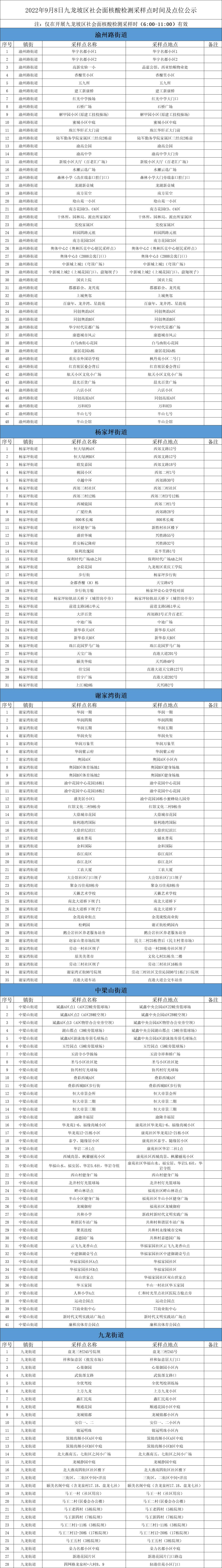 9月8日—9日重庆九龙坡区社会面核酸检测采样点安排