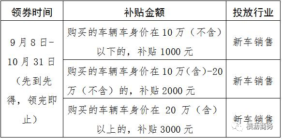 2022年9月8日至2022年10月31日,共投放50万元电子消费券,消费者到参与活动的门店购买“国六”标准全新燃油车或新能源汽车的即可领取电子消费券(先到先得,领完即止)。