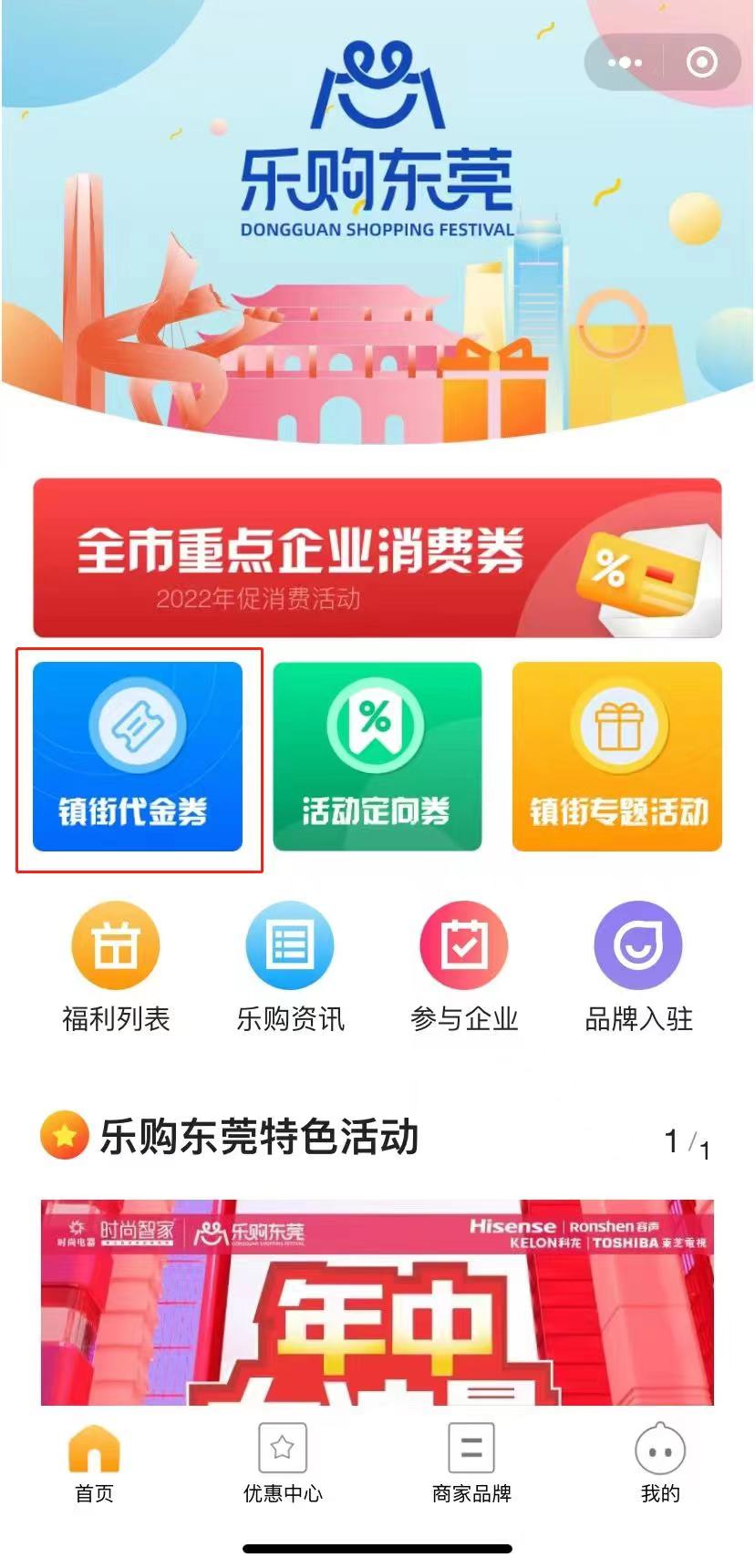 1、进入【乐购东莞】小程序,点击“镇街代金券”
