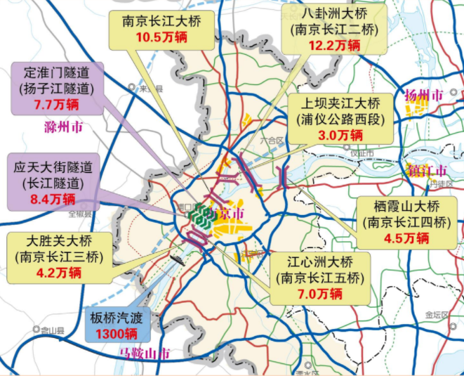 过江流量预测:中秋假期期间,预计我市过江通道日均总交通流量为57.6万辆,南京长江大桥、八卦洲大桥日均交通流量总体相对较高。