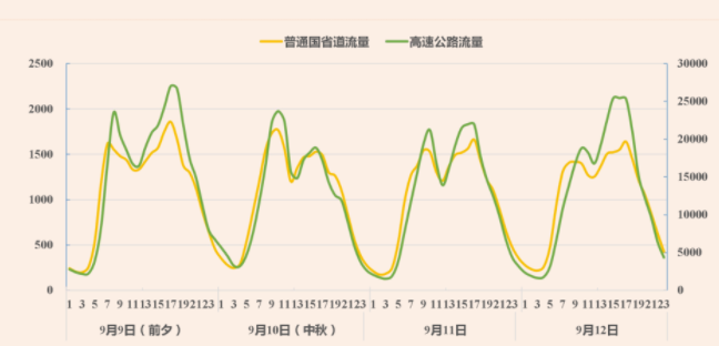 易拥堵时段:9月9日(假期前夕)16:00-18:00、9月10日10:00-11:00、9月12日16:00-18:00,从时间分布特征来看,预计中秋假期前夕、首日及最后一天都将出现集中出行的情况,其分时交通情况如下: