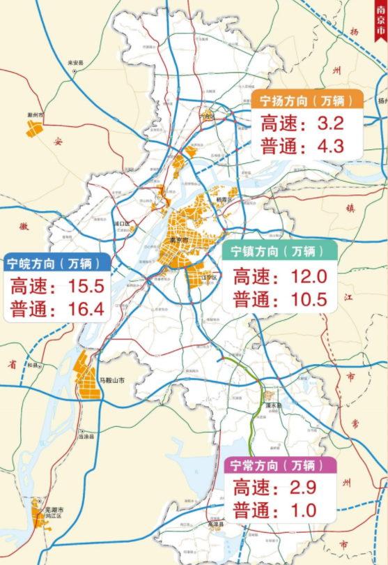 对外流量预测:中秋假期期间,预计南京市干线公路对外交通流量约为65.8万辆/日。其中往来安徽的交通流量最多,约占总体对外交通流量的48.4%。