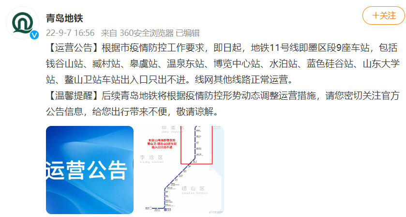 9月7日,从青岛地铁官方微博了解到,根据市疫情防控工作要求,即日起,地铁11号线即墨区段9座车站,包括钱谷山站、臧村站、皋虞站、温泉东站、博览中心站、水泊站、蓝色硅谷站、山东大学站、鳌山卫站车站出入口只出不进。线网其他线路正常运营。