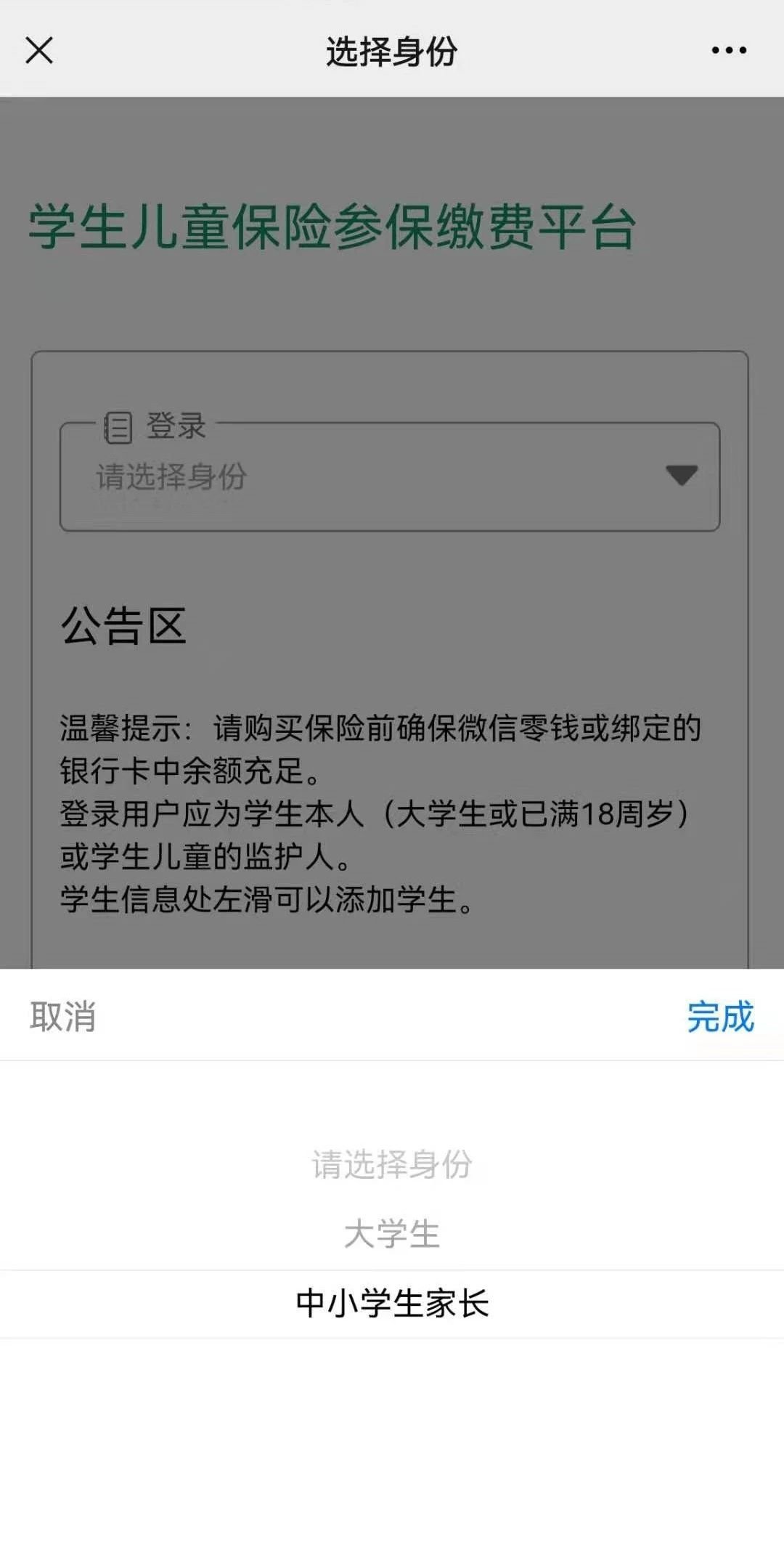 请使用投保人(中小学生家长或年满18周岁的大学生)本人实名认证的微信进行投保