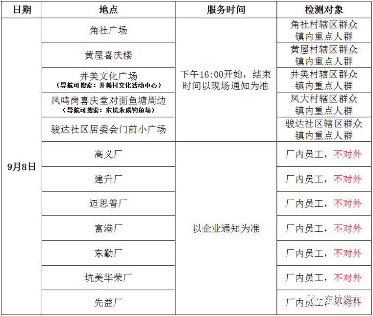 根据市新型冠状病毒肺炎疫情防控指挥部统一部署,9月8日,东坑将进一步扩大区域核酸抽检范围,增加黄屋村、井美村、凤大村,具体安排如下: