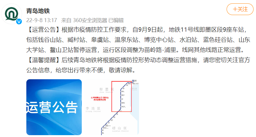 根据市疫情防控工作要求,自9月9日起,地铁11号线即墨区段9座车站,包括钱谷山站、臧村站、皋虞站、温泉东站、博览中心站、水泊站、蓝色硅谷站、山东大学站、鳌山卫站暂停运营,运行区段调整为苗岭路-浦里。线网其他线路正常运营。