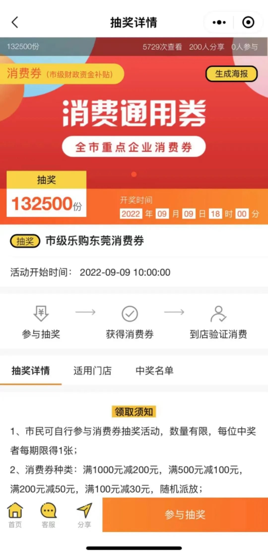 9月9日-11日「乐购东莞」三天派发2100万元通用消费券,采用线上抽奖形式,每天18:00开奖。