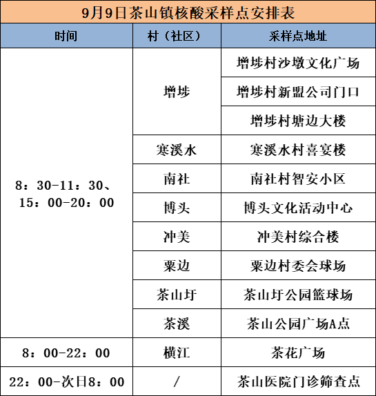 9月9日茶山开展核酸循环抽检,街坊们可按下面安排表就近前往免费采样。