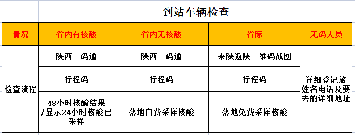 进站旅客查验 48小时内核酸检测结果或 24小时内核酸采样证明(乘坐灵台班车的旅客查验“一码通”二维码、行程码及24小时核酸检测结果),主动扫描陕西一码通、行程码,配合工作人员进行体温测量,正确佩戴口罩。请广大旅客做好个人防护,间隔“一米”安全距离排队,有序进站乘车。请广大旅客关注目的地疫情防控政策,提前做好出行准备。