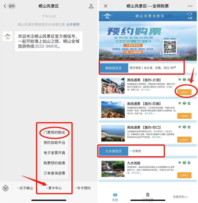 崂山风景区分为南线游览区(两日有效 含巨峰、太清、仰口、华严)、九水游览区。选择前往游览区→阅读须知内容→选择进山时间段→按要求填写信息