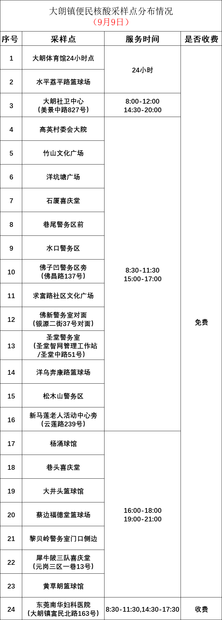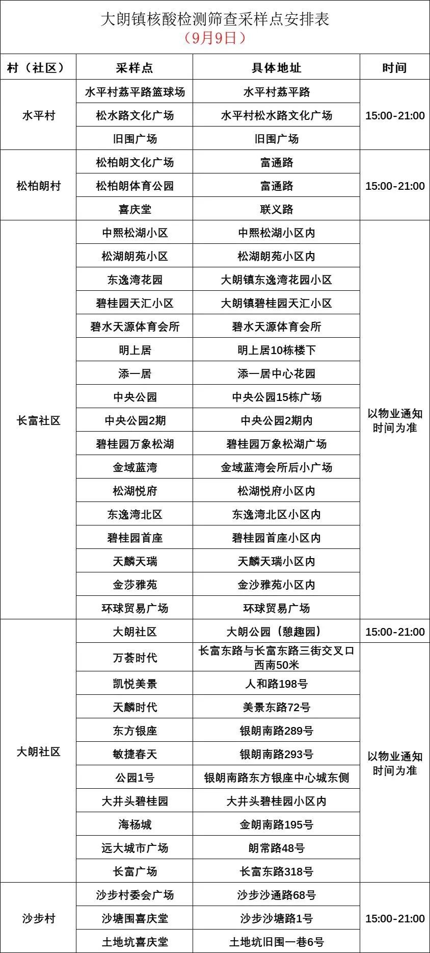 9月9日,大朗核酸筛查采样点设置详见下图,核酸采样点具体位置会根据现场实际调整,请以村(社区)通知为准。