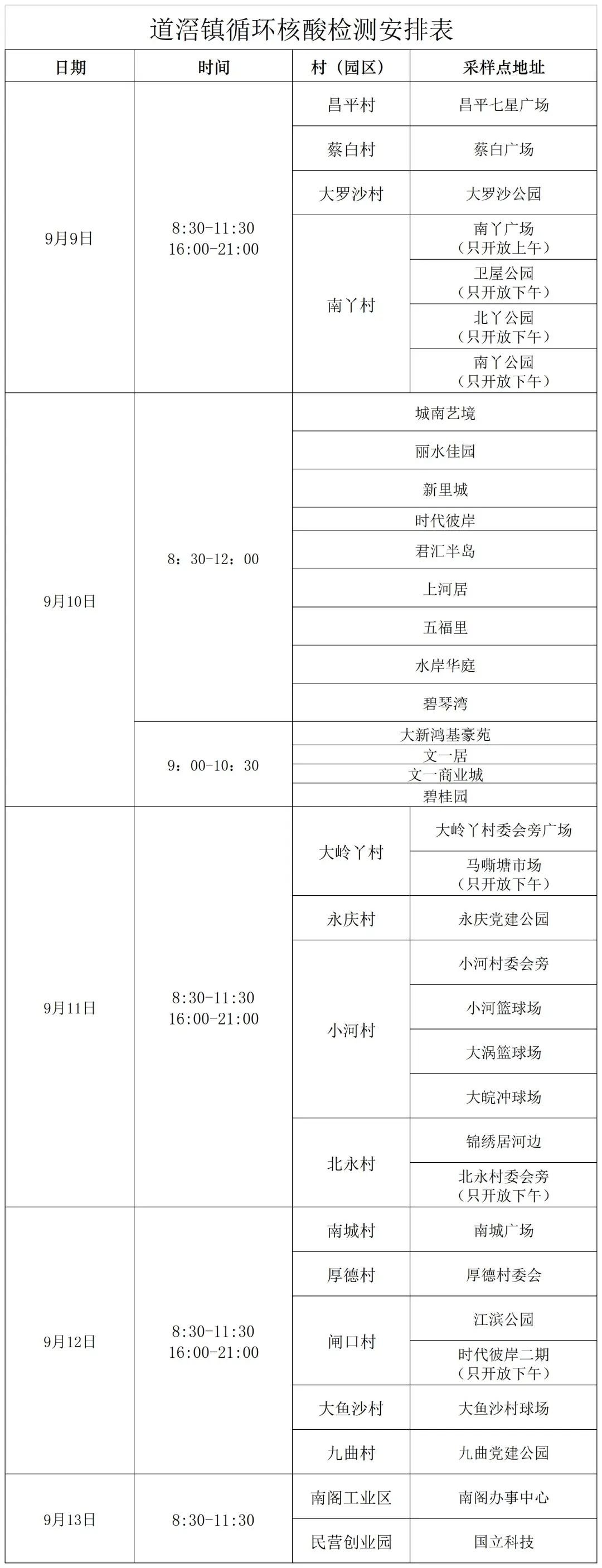 9月9日—9月13日道滘镇循环核酸检测安排表