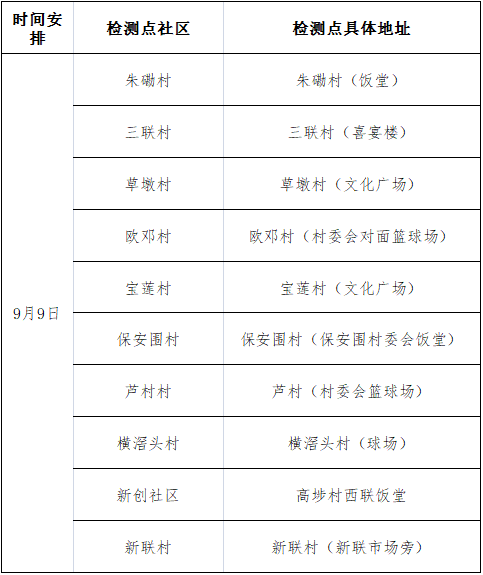 三、检测地点:全镇共设置10个固定核酸检测点(具体见下表),请市民选择就近检测点进行免费检测。