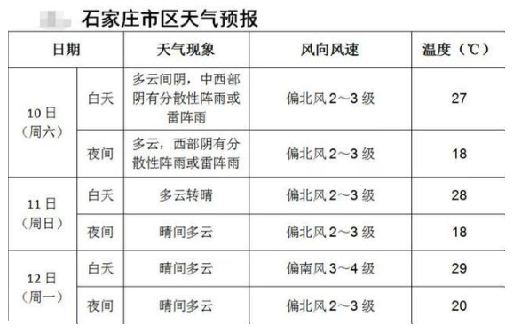 明天(10日)白天到夜间,保定西部、石家庄、邢台、邯郸阴有分散性雷阵雨或阵雨,其他地区多云间阴。