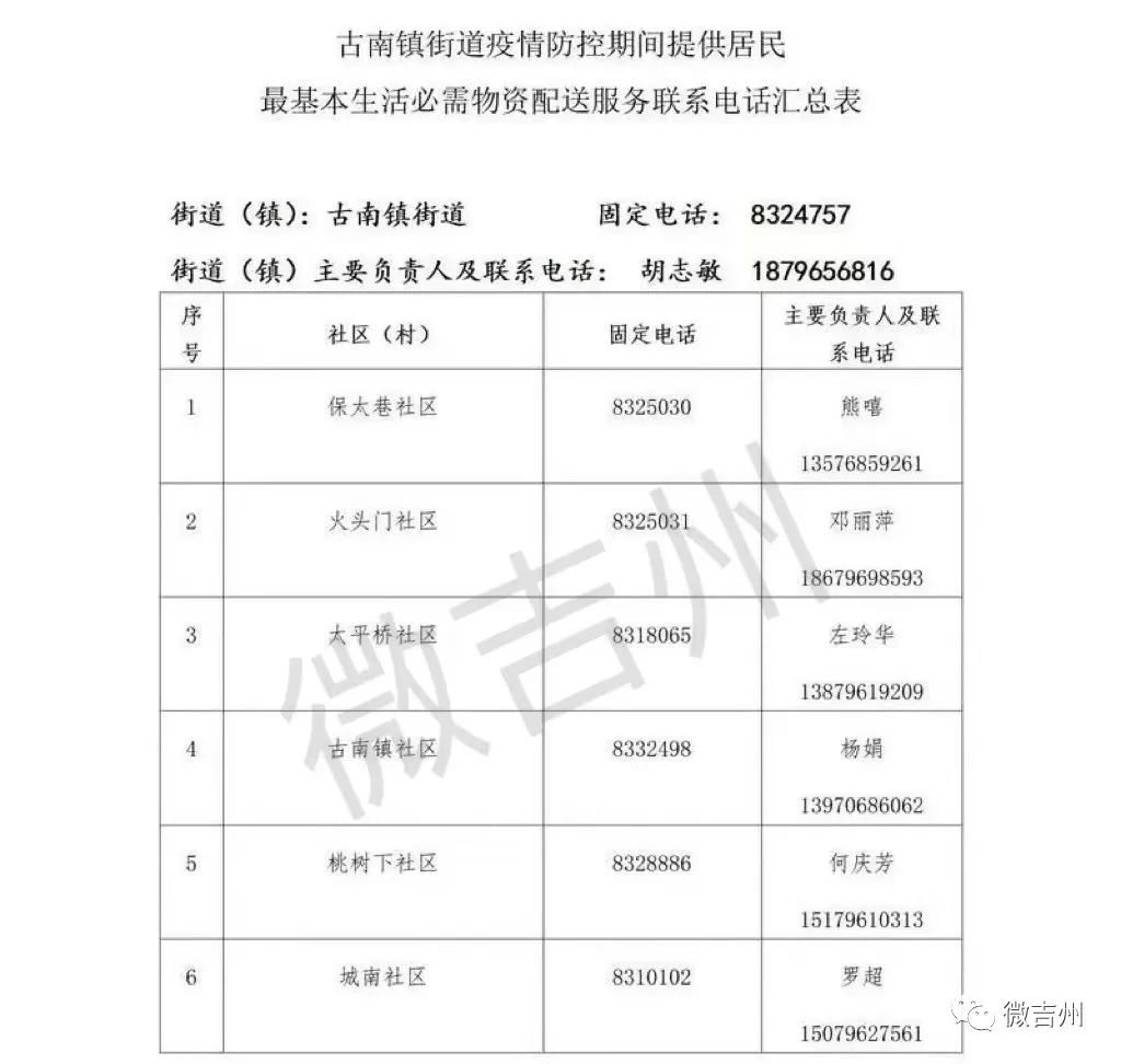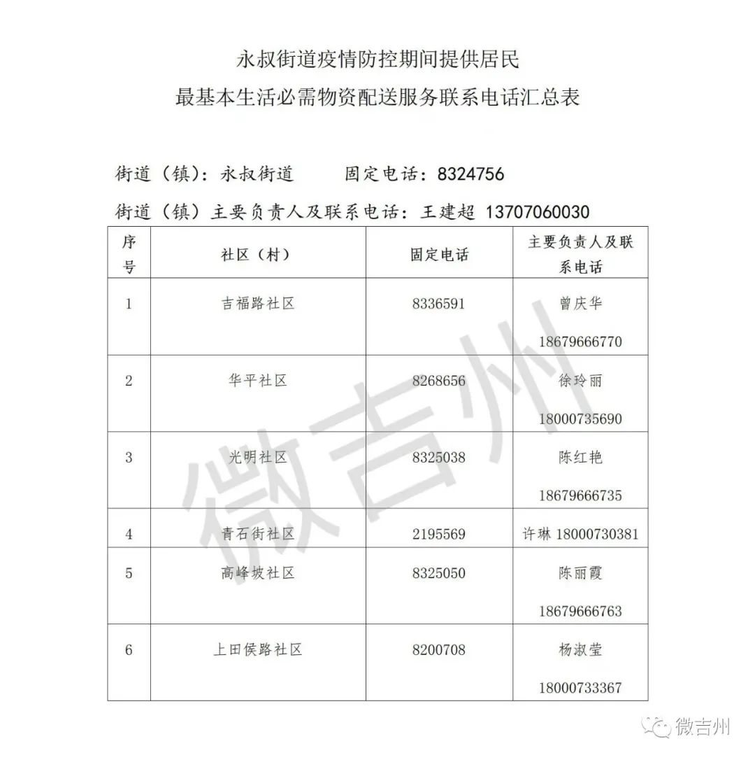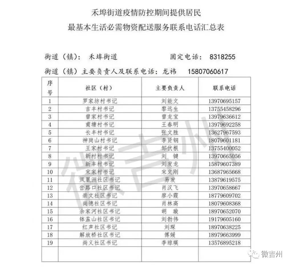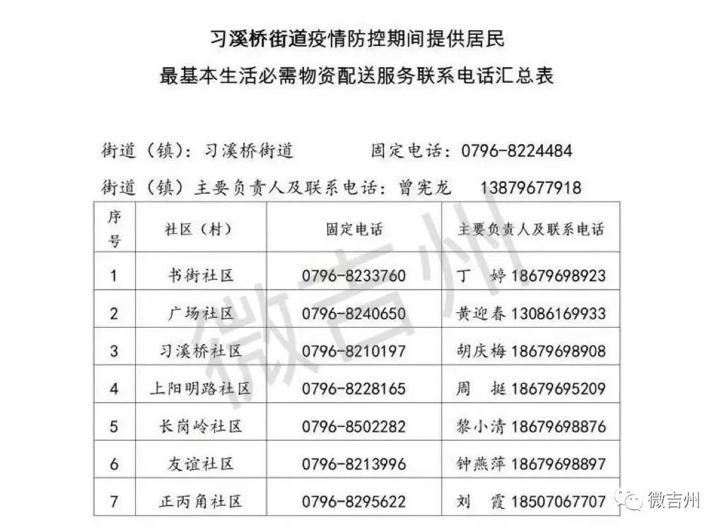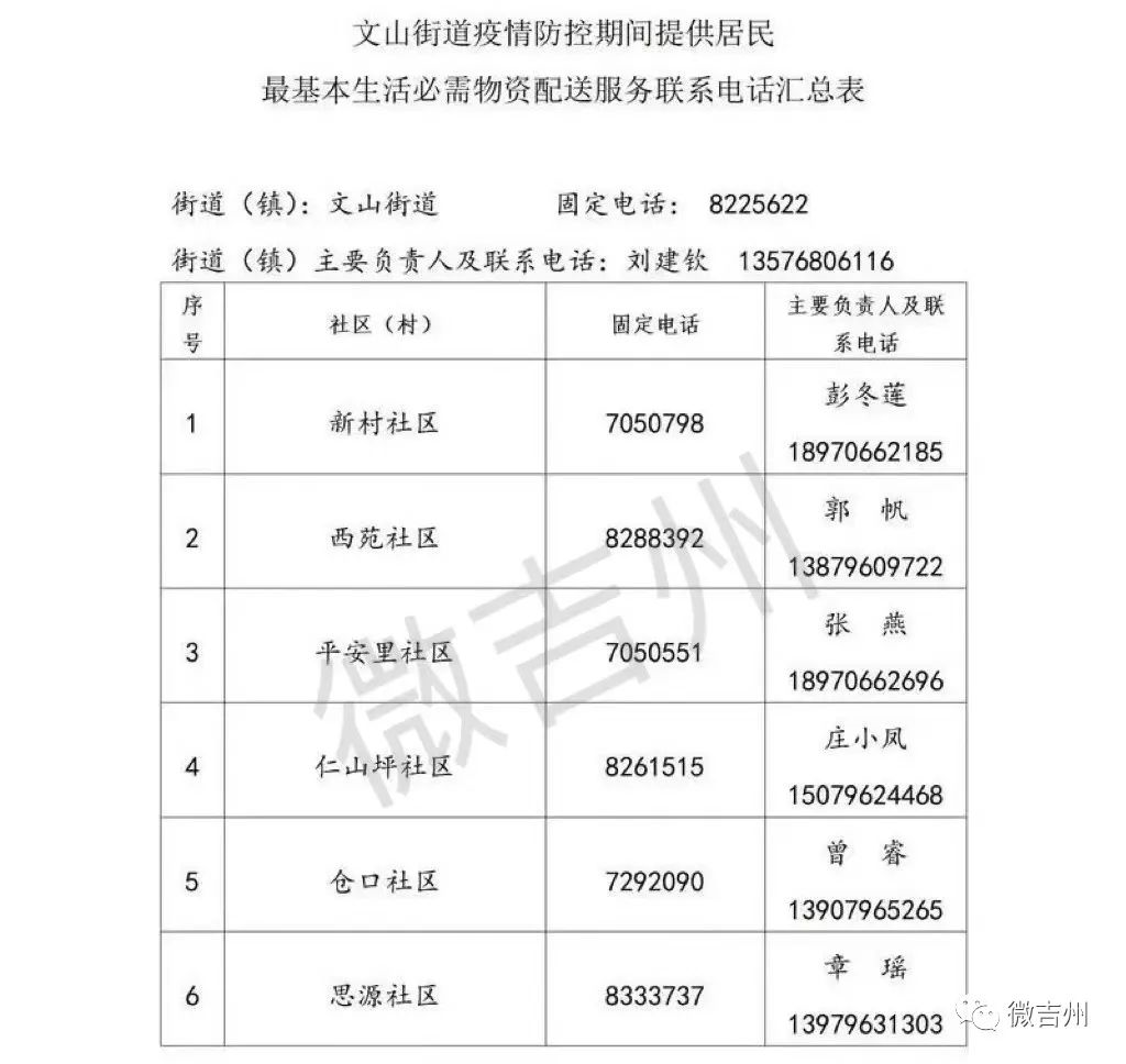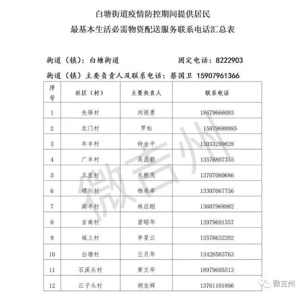 吉州区各镇街疫情防控期间居民基本生活必需品配送服务电话