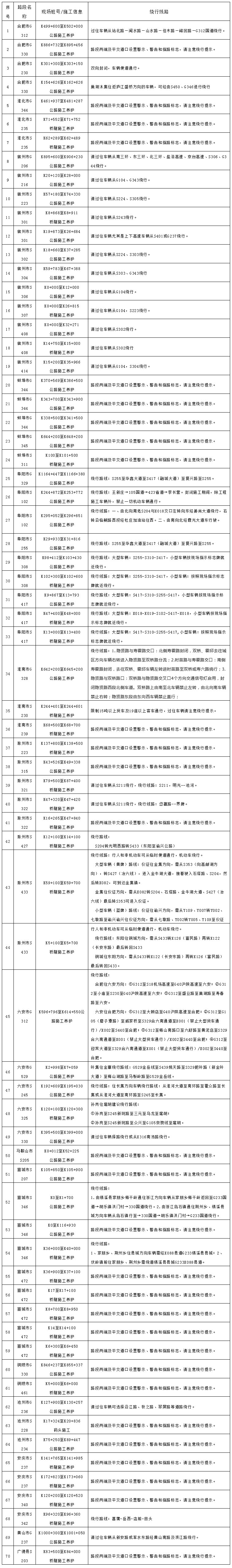 (六)G5011芜合高速马鞍山西枢纽芜湖往无为、马鞍山方向匝道封闭施工(车辆可从巢湖收费站调头上高速);合肥往芜湖方向98公里+500米至94公里+140米(老高山隧道路段)封闭施工,车辆半幅双向通行。