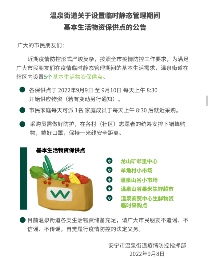 温泉街道关于设置临时静态管理期间基本生活物资保供点公告