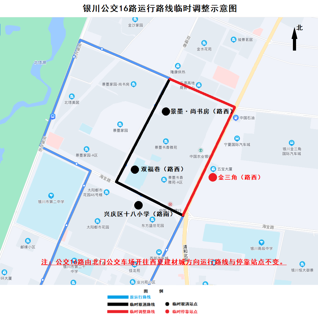 注:公交16路由北门公交车场开往西夏建材城方向运行路线与停靠站点不变。