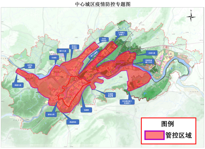 宜屏快速路、高捷大道、普和大桥、高速西站、弘毅路、宜威路姚家嘴、宜长路宋家工业园路口、宜南快速路三江村、志城大道、大学路文体路口、观斗山隧道、S436(象鼻段)、机场东连接线、振兴大道、东坡街合围区域内的所有道路(含上述道路)。