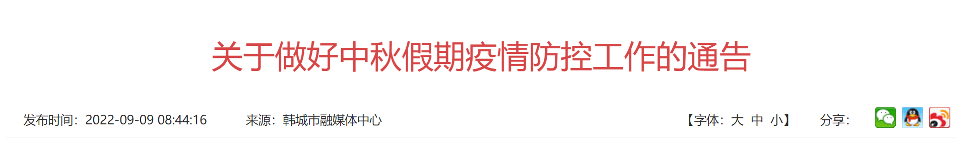 韩城市9月9日发布关于做好中秋假期疫情防控工作的通告