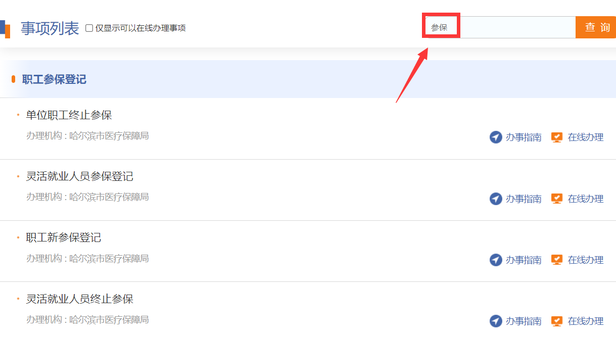 第二步:在搜索框中选择输入【参保】即可获取参保登记办理事项