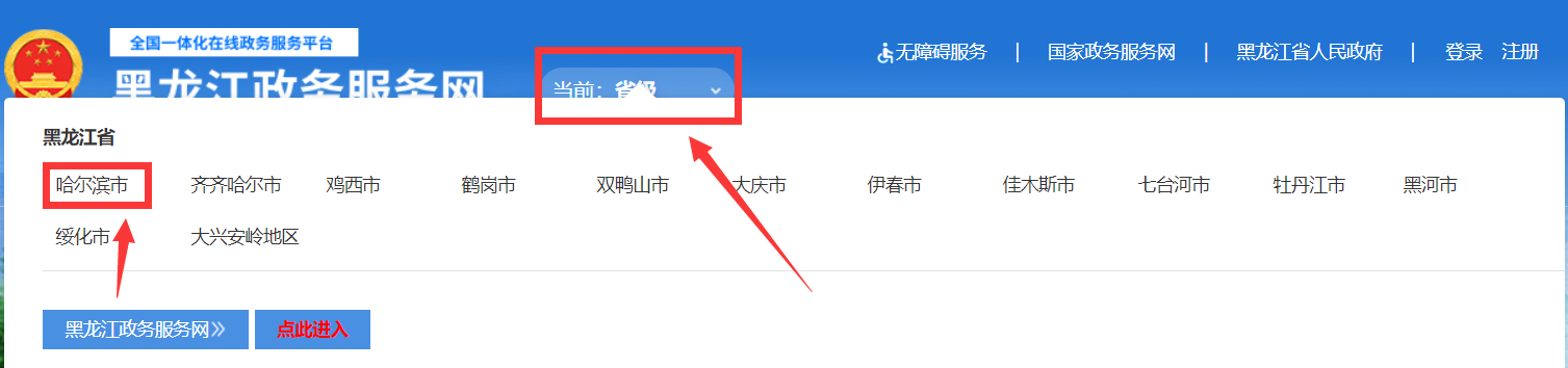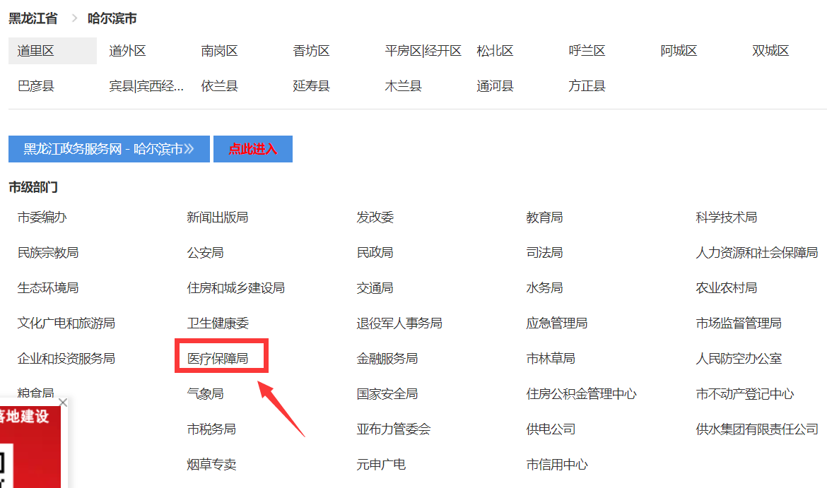 第一步:登录黑龙江政务服务网,在【省级】上面选择【哈尔滨市】,【市级部门】下方选择【医疗保障局】