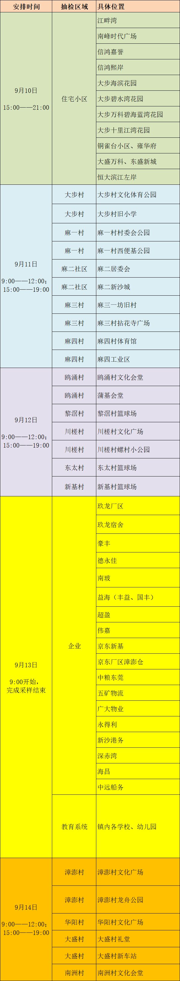 根据最新安排,麻涌镇于9月10日-14日分时段分区域在辖区范围内开展免费核酸抽检。今天(9月10日)15:00-21:00,镇内部分大型住宅小区(详见下表)将进行免费核酸抽检,请相关区域人员主动配合,就近就便参加检测,重点人员及外市旅居史人员落实应检尽检,不漏一人。