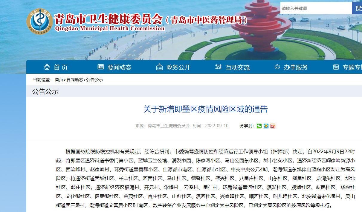 2022年9月9日22时起青岛即墨区新增中高风险地区