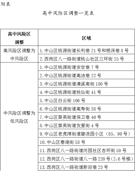 按照国务院联防联控机制《新型冠状病毒肺炎防控方案(第九版)》等规定,市疫情防控总指挥部决定,即日起将我市中山区桃源街道长利巷21号和根深巷8号等2个高风险区调整为中风险区,将中山区桃源街道安定巷7号等23个中风险区调整为低风险区(详见附表),并实施相应防控措施。届时,普兰店区全域无高中风险区,按照市总指挥部要求落实相关疫情防控措施。