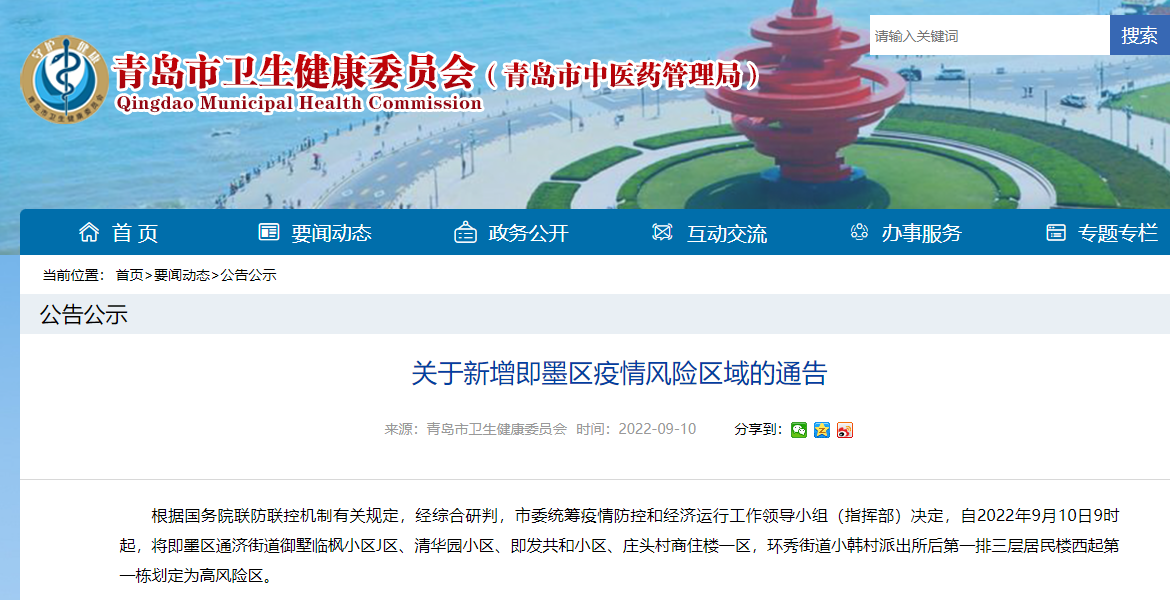 2022年9月10日9时起青岛即墨区新增高风险地区