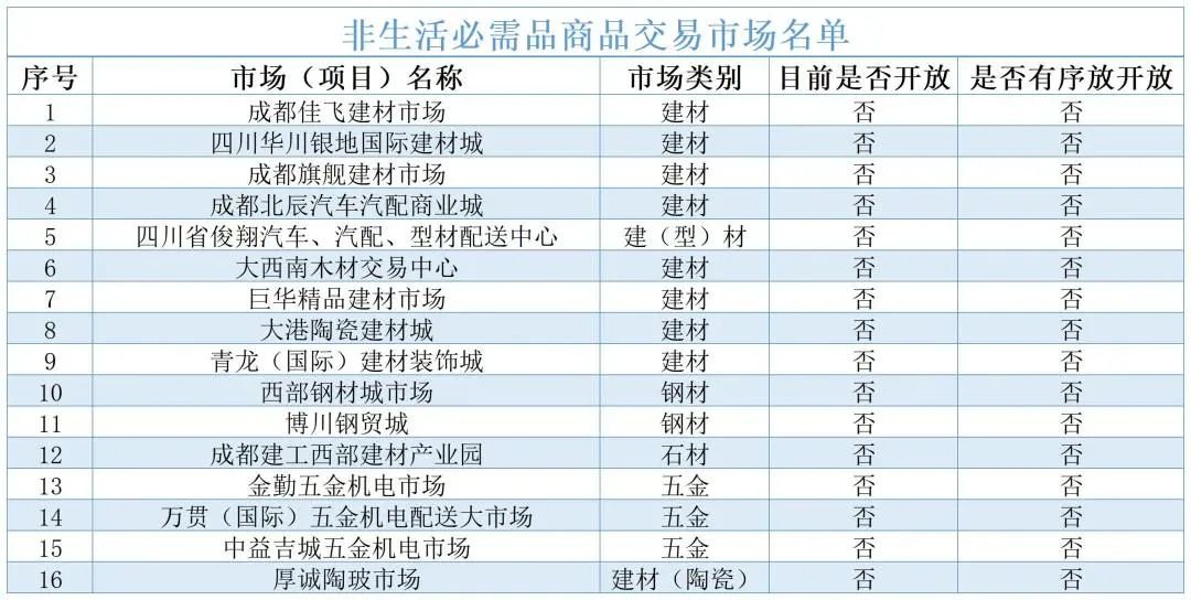 (二)全区五金机电、建(型)材、钢材、石材等16个非生活必需品商品交易市场(详见末文)暂停营业。