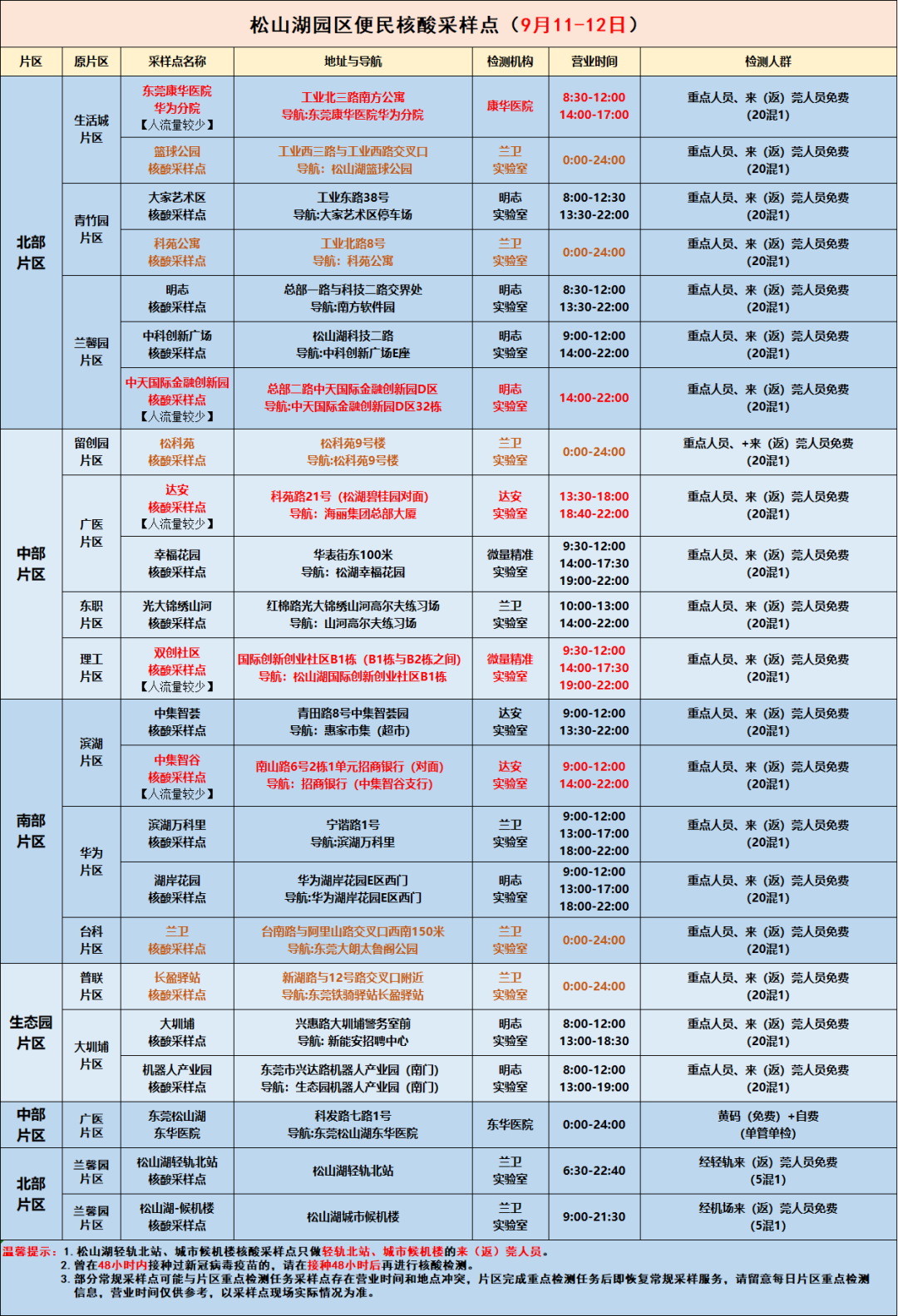 9月11日至12日,松山湖将分时、分区域开展新冠病毒核酸免费检测工作。同时,松山湖设置20多个便民核酸采样点(其中5个24小时服务点)为重点人群提供免费检测。请群众积极配合,严格落实相应健康管理和核酸检测工作,主动检测。现将有关安排通告如下: