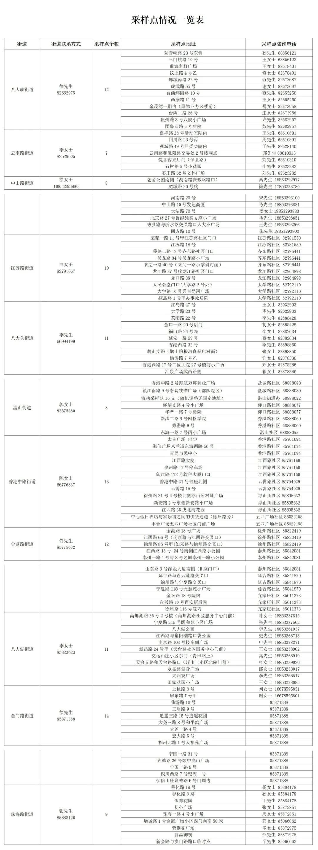 由各街道办事处统一安排采样点,具体信息详见采样点情况一览表(附后),或扫描“市南区核酸检测采样点地图小程序”(附后),对核酸检测采样点进行查询。
