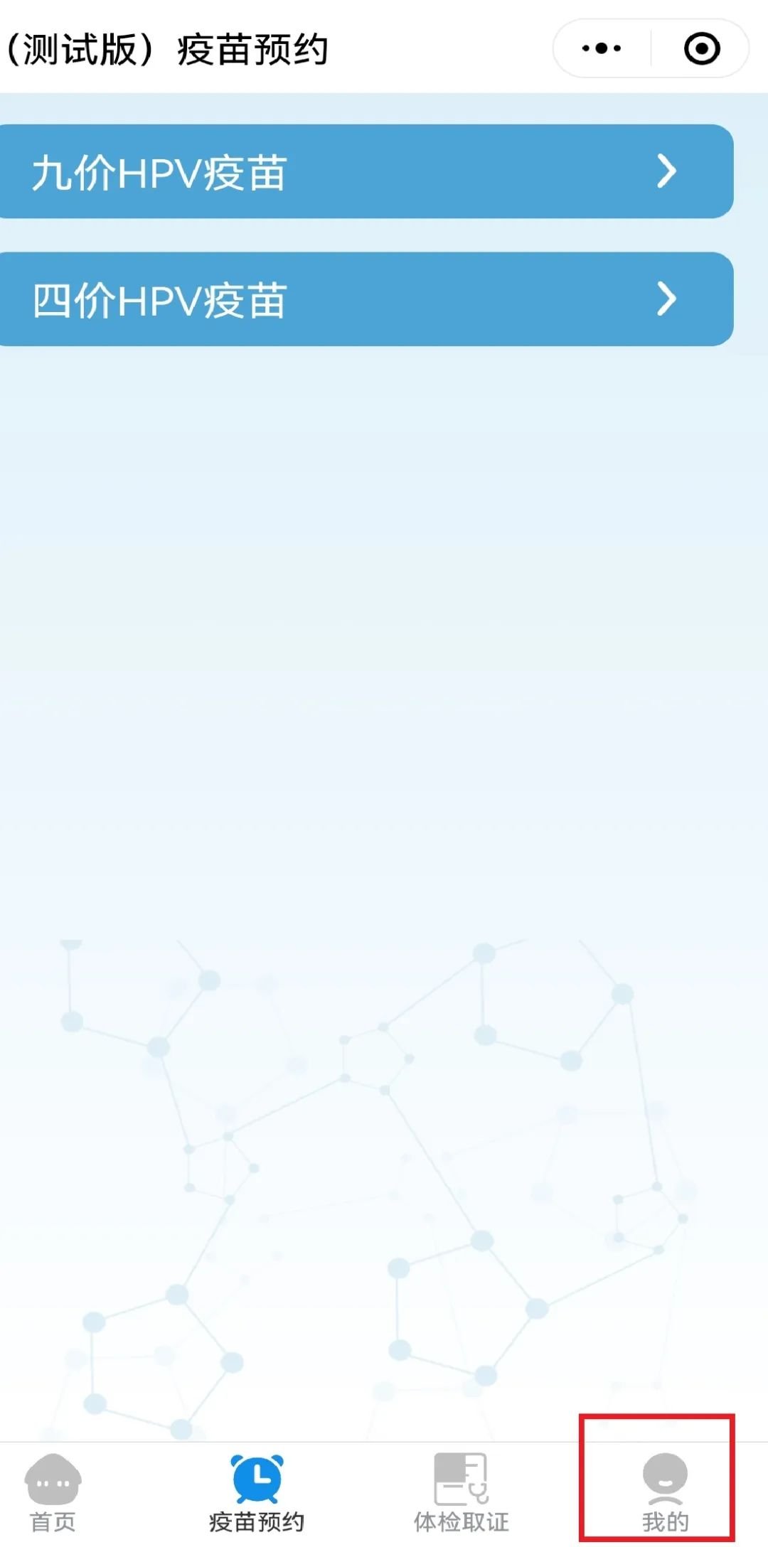 3.第三步进入疫苗预约界面后点击【我的】完成个人信息注册并登陆,手机号码请点击【获取手机号】