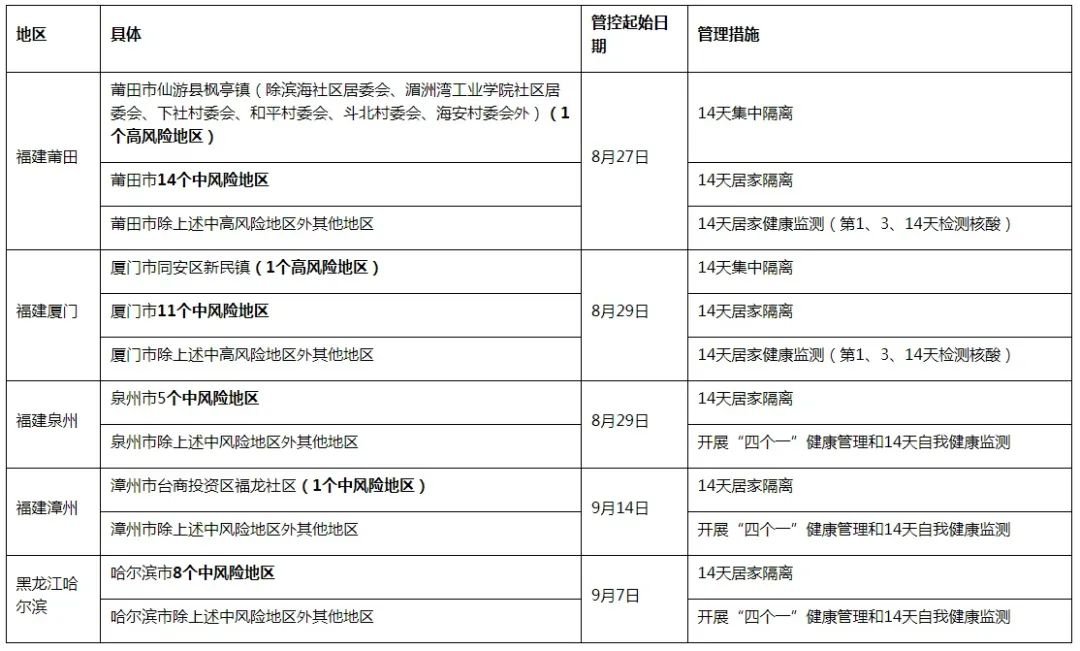 9月23日,广东省疾病预防控制中心官网发布对重点地区来(返)粤人员健康管理措施。截至当天11时,福建莆田、厦门、泉州、漳州和黑龙江哈尔滨等地重点地区来(返)粤人员要执行相应健康管理措施。具体内容如图:
