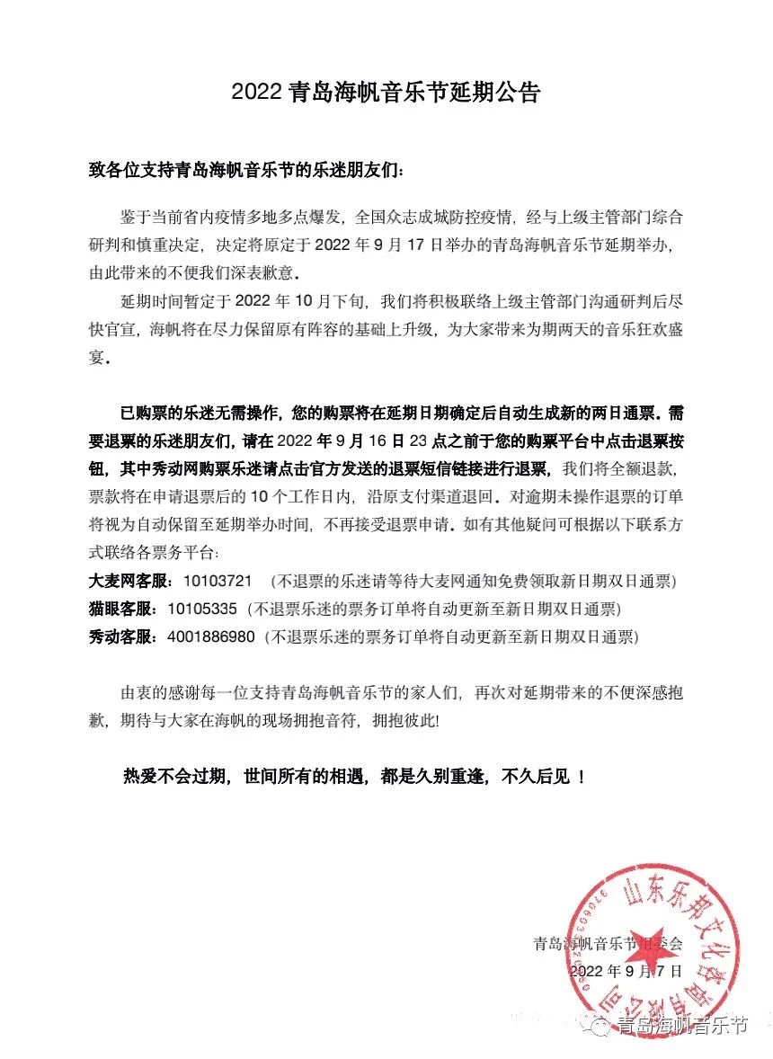 鉴于当前省内疫情多地多点爆发,全国众志成城防控疫情,经与上级主管部门综合研判和慎重考虑,决定将原定于2022年9月17日举办的青岛海帆音乐节延期举办,由此带来的不便我们深表歉意。
