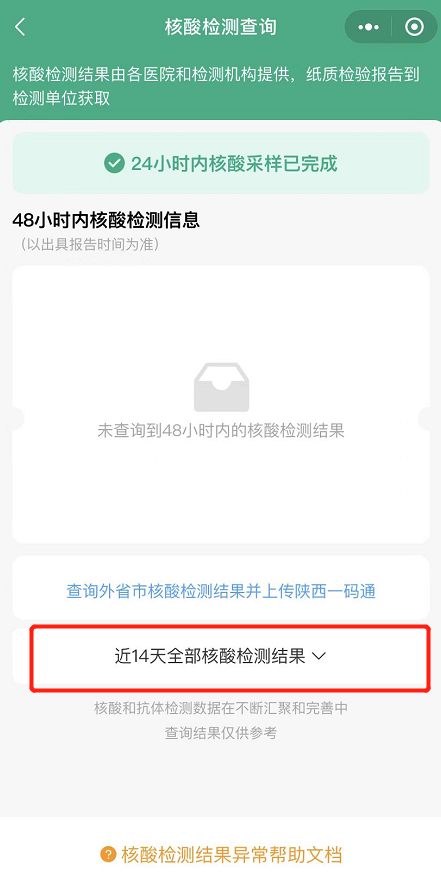 2、直接查看核酸结果/点击“14天全部核酸检测结果”