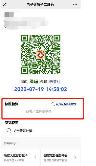 进入湖南省居民健康卡,点击【健康卡】,在核酸检测栏点击获取最新数据