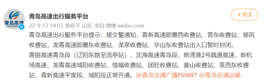 @青岛高速出行服务平台于2022年9月13日14:03发布提示: