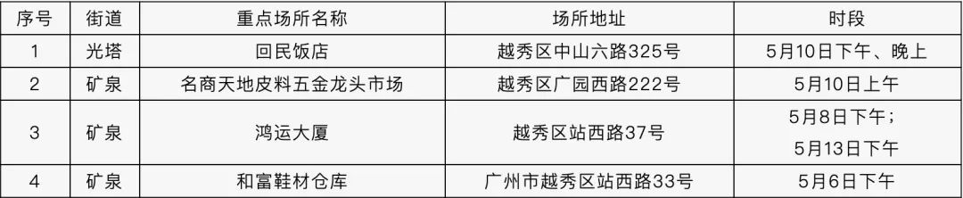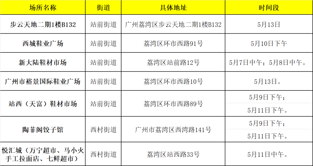 一、因疫情防控需要,请在相关时段到佛山市里水镇、大沥镇,以及广州市荔湾区、越秀区、白云区以下重点场所的人员,立即向所在村(社区)联系报备,并落实5天居家健康监测,在第1、3、5天进行核酸检测。
